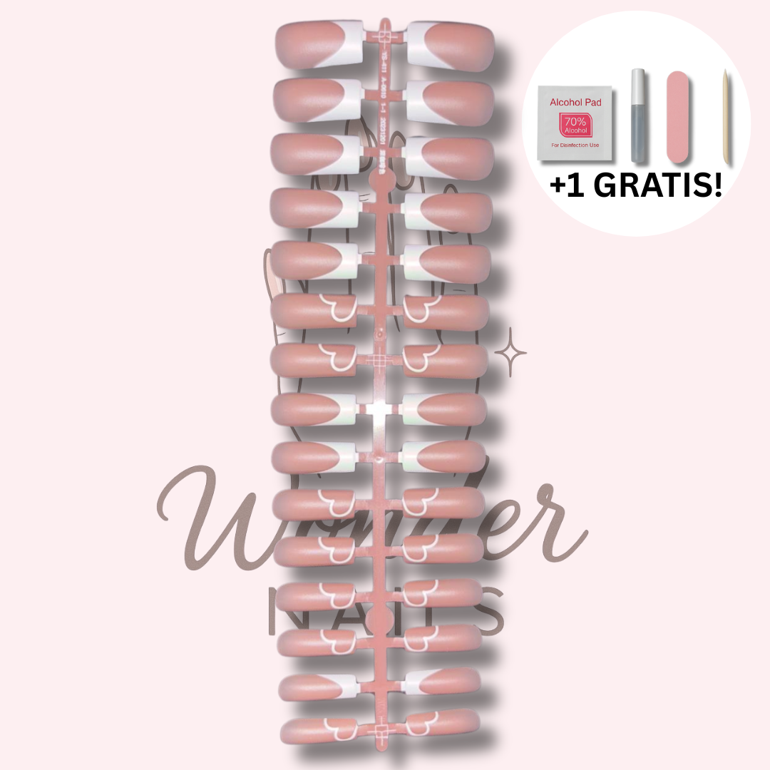 Stil: Klassisches French-Design mit feinen Herzlinien und mattem Finish für einen romantisch-modernen Touch