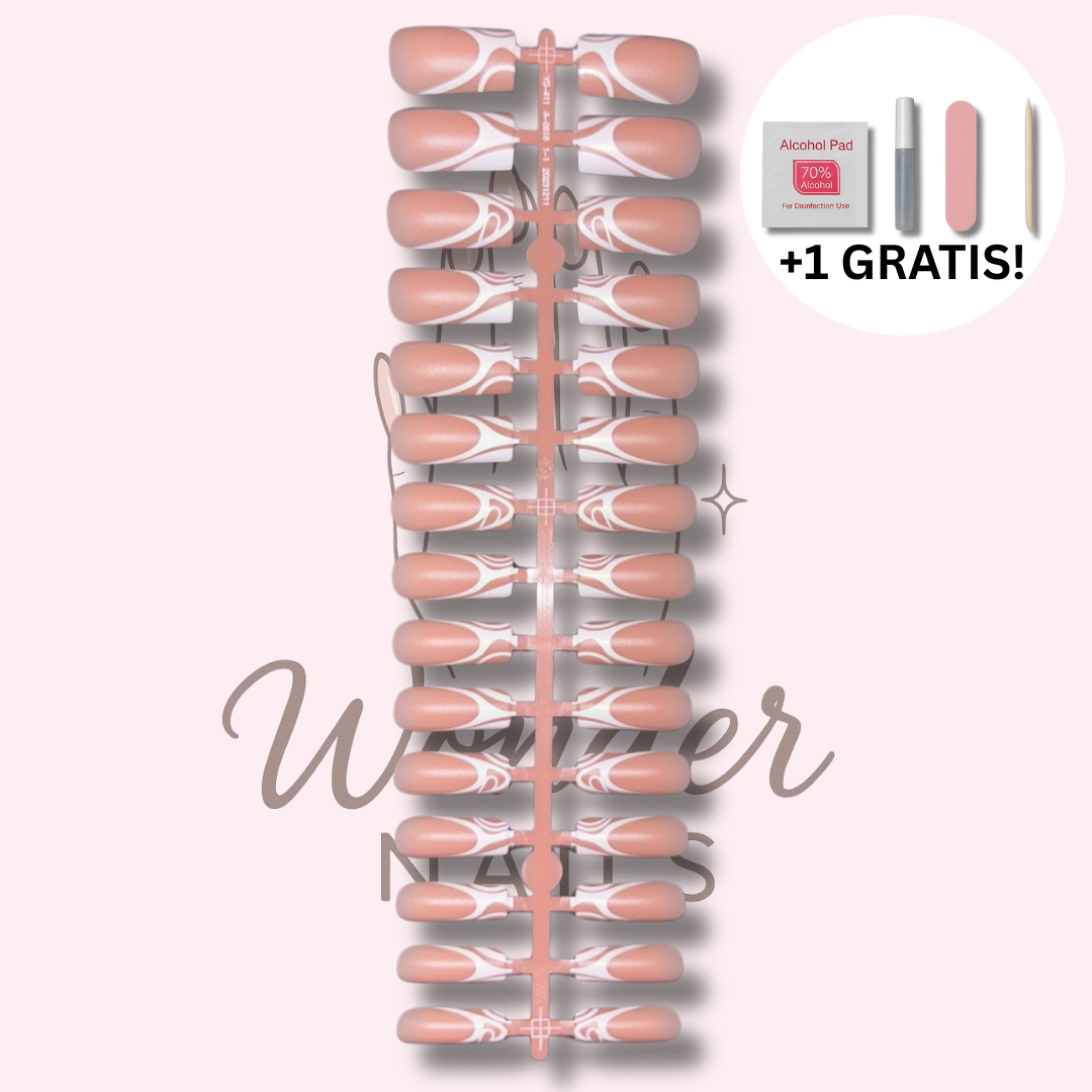 Stil: Nude-Rosé Grunddesign mit weißen, fließenden Linien – ein moderner Abstract-French-Look mit klarer Eleganz